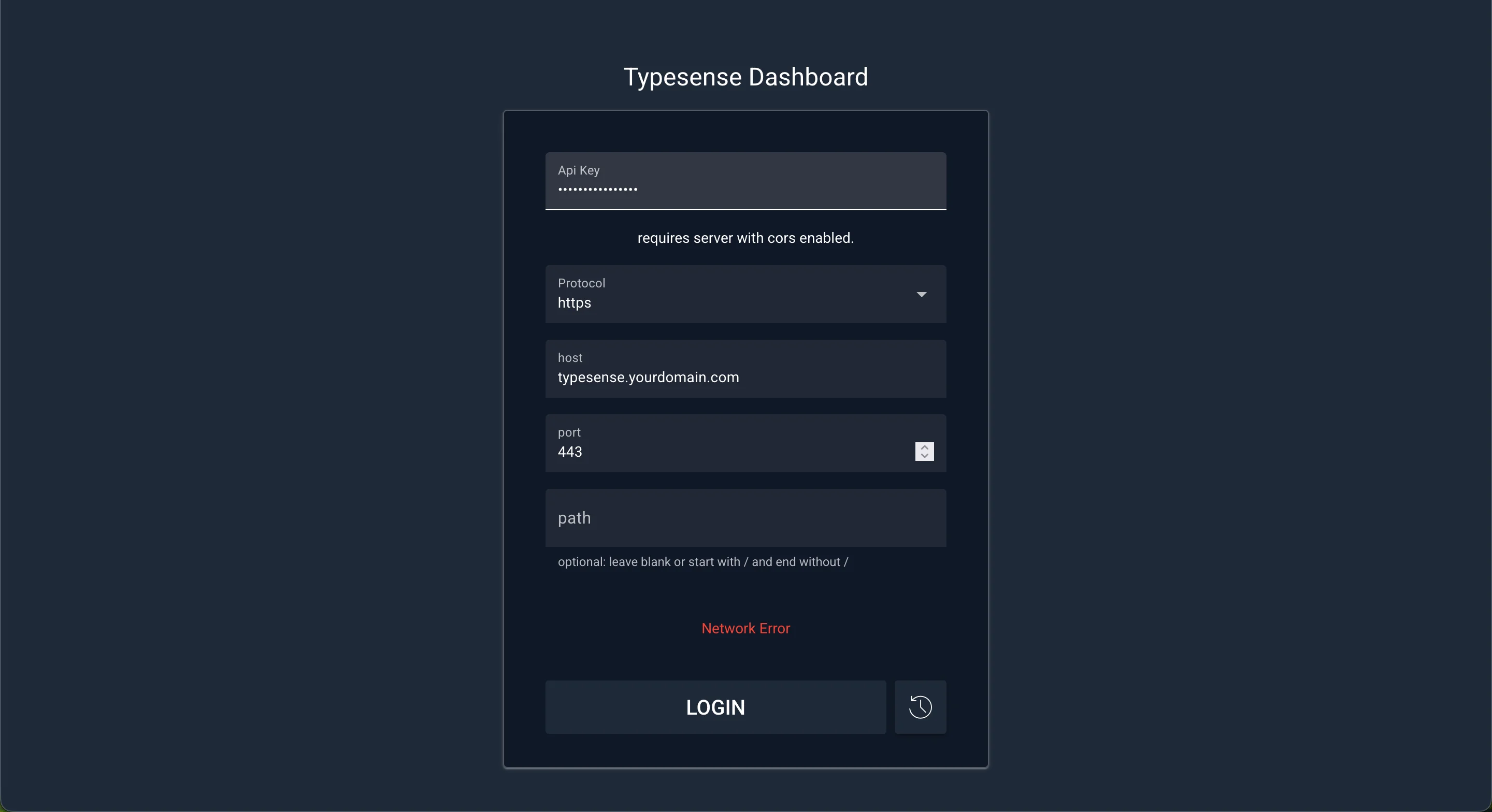 # Route traffic for the Typesense APItypesense-api.yourdomain.com { # Proxy requests to the typesense container on its internal port 8108 reverse_proxy typesense:8108}TYPESENSE_API_KEY=YOUR_KEYPUBLIC_PATH=/dashboardTYPESENSE_HOST=typesenseTYPESENSE_PORT=8108TYPESENSE_PROTOCOL=httpReplace the typesense api key with your generated admin api key or by default it is xyz